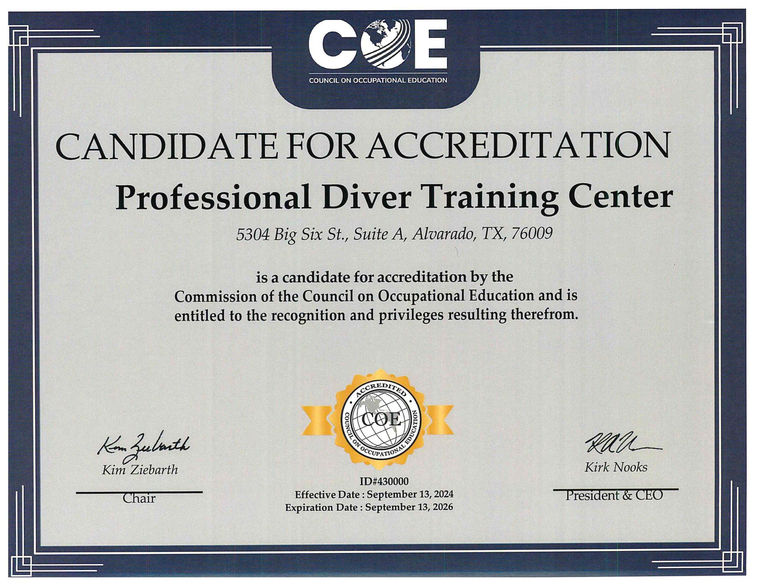 Classes are taught here at our facility in alvarado, texas. Professional Diver Training Center’s Commercial diving program is a 700-hour program that exceeds the 625 hours required by the ADCI (Association of Commercial Diving Contractors International), ANSI (american National Standard Institute), and the ACDE (Association of Commercial Diving Educators) for an Entry Level Diver/Tender. We offer job search as part of the program, so you can begin your new career at graduation. financing is available – see the Admissions Tab above.